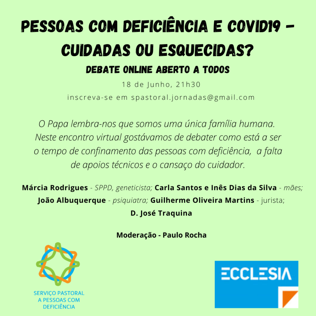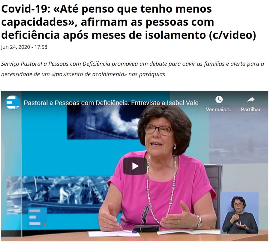 No passado dia 18 de junho teve lugar um debate online sobre o impacto da pandemia na vida das pessoas com deficiência. Leia a notícia da Agência Ecclesia e veja a entrevista a Isabel Vale, diretora do SPPD.